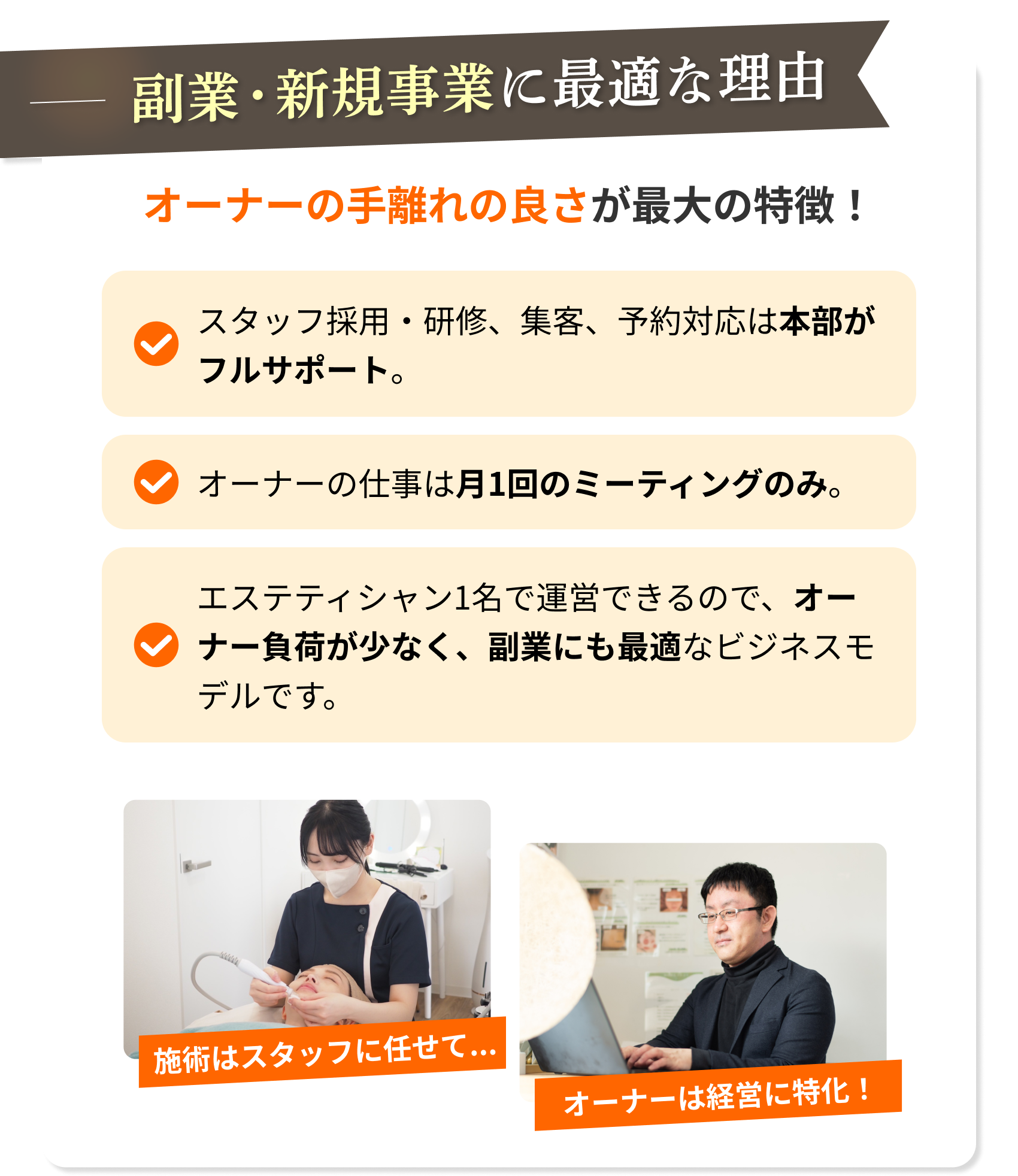 会社員の収入だけでは将来に不安を感じ、未経験から低資金で始められる副業を検討。加盟の決め手は、本部による手厚いサポート。開業後は5ヶ月で黒字化に成功し、8ヶ月目には2ブース目をオープン!1日30分の副業が大きな収入につながっています。