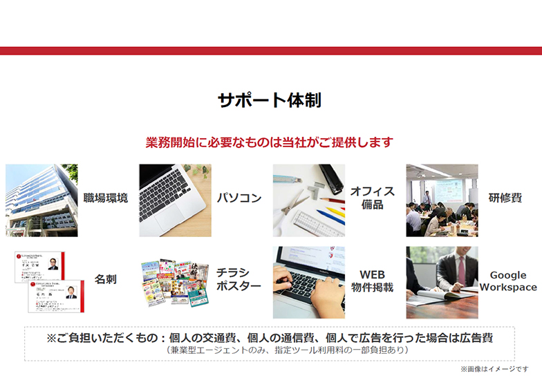- 雇用ではない新しい働き方で、自身の活動に応じた報酬を得たい方。不動産業界の経験は問いません。独立志望の方や副業との両立をお考えの方も歓迎。