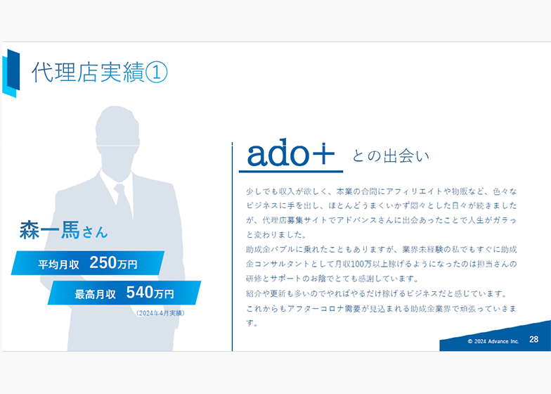 - 「ado+」は厚生労働省が管轄している助成金コンサルティングサービス。企業に対して助成金申請サポートを含む年間契約プランを紹介するのがメイン業務です。集客は本部が提供する[助成金診断サイト]でサポート。雇用保険加入の従業員が1名いれば対象となり、法人/飲食店/美容室/クリニック/個人事業主もターゲットです。