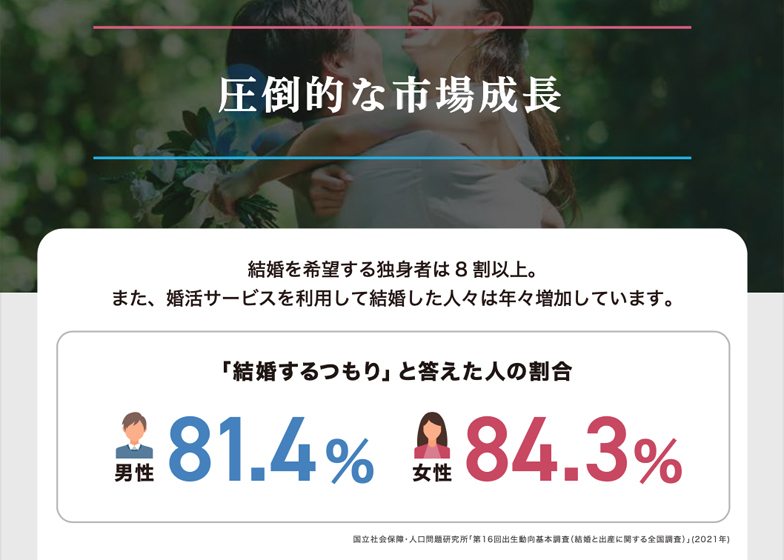 日本国内の深刻な課題である少子高齢化・人口減少問題に歯止めをかけるには婚姻率を上げるしかありません。社会的意義・注目度が年々高まっています