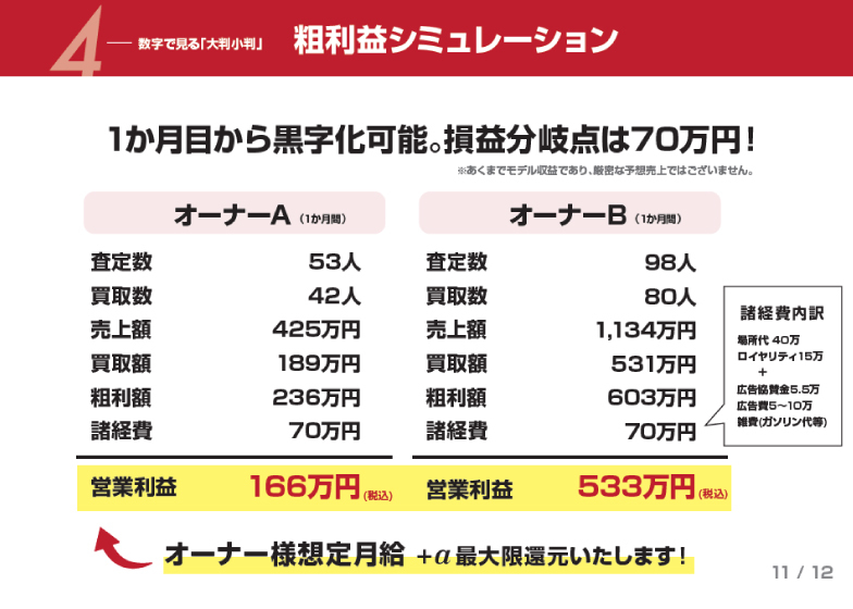 - 店舗取得の必要がないので、人数さえいれば何店舗でも同時出店が可能!査定は本部が行うため、未経験のアルバイトにも店頭接客を任せられます。