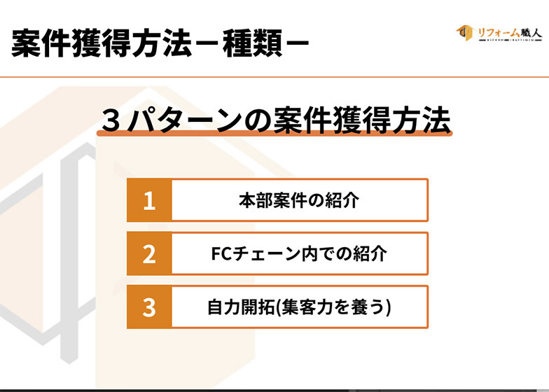 本部に来た案件を加盟店に紹介も可能。その場合の顧客は自身の顧客にできるので、本部は紹介料などは一切いただきません。