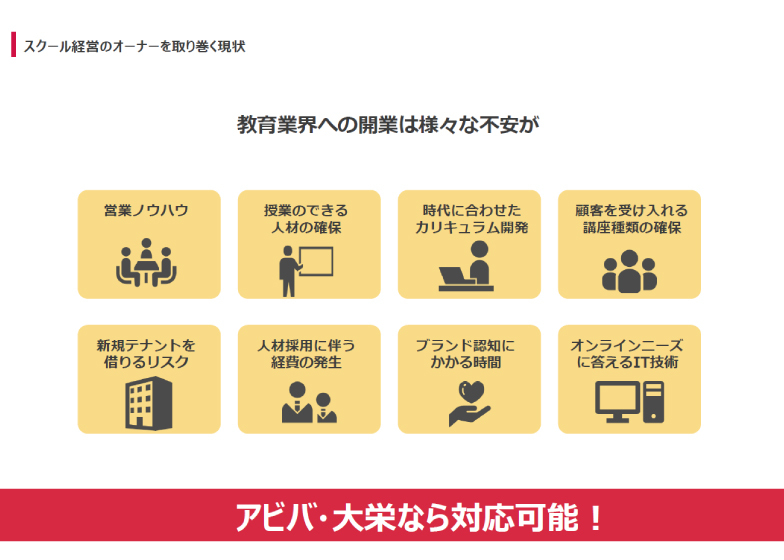 - ■資金も手間も最小限で新たな事業を始めたい方 【特におすすめ】学習塾などの既存事業をお持ちの方であれば、空きスペースを活用してスピーディーな開業が可能!収益拡大はもちろん、顧客開拓にも繋がります。